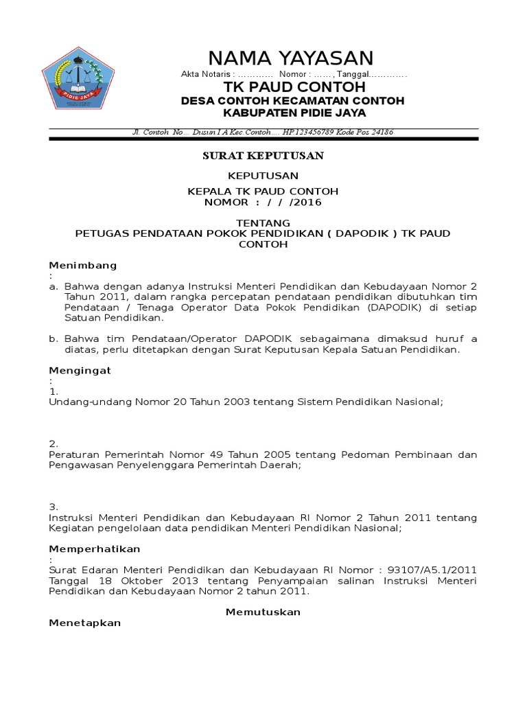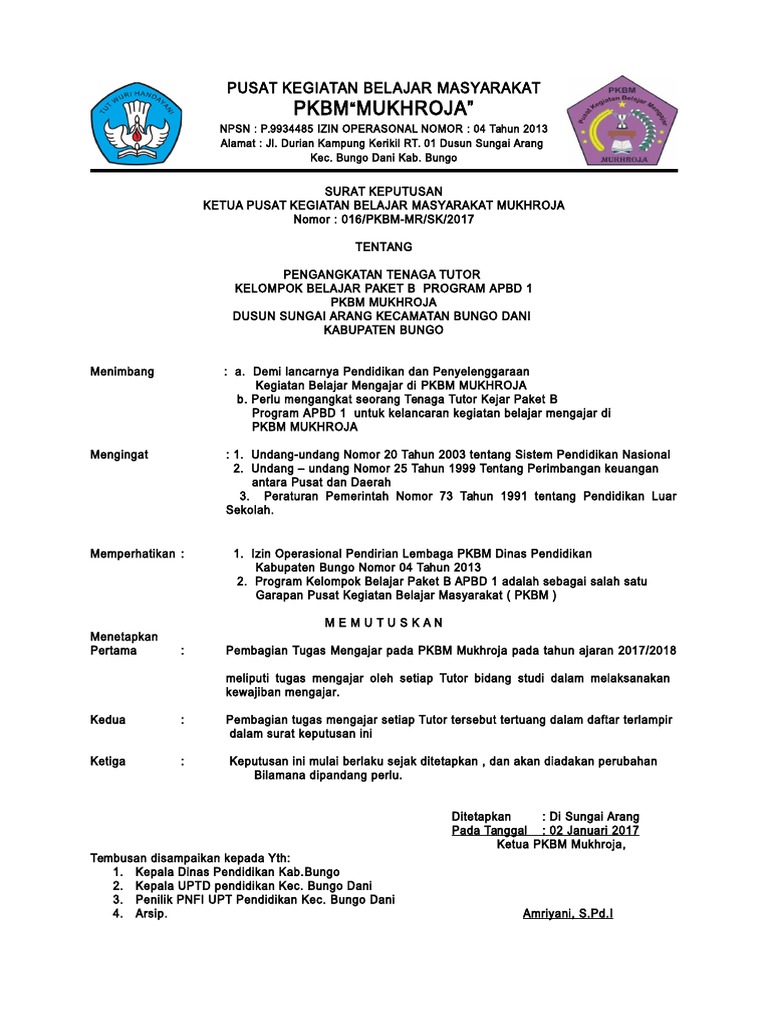 Format sk guru paud/ tk dari kepala sekolah tahun 2017/2018 ini merupakan salah satu contoh surat keputusan yang akan saya bagikan dalam kesempatan kali ini khususnya untuk kebutuhan pengangkatan guru paud/tk oleh kepala sekolah. Home » contoh, sk, mutasi, guru, paud; Sasaran kurikulum 2013 tersebut tertuang dalam. Contoh surat pengangkatan pengurus dan tenaga pengajar pendidikan paud. Contoh sk pembagian kiprah mengajar guru paud tk ra kober sch paperplane. Mendikbudristek telah menandatangani permendikbudristek nomor 5 tahun 2022 tentang standar kompetensi lulusan pada pendidikan anak usia dini, jenjang pendidikan dasar, dan jenjang pendidikan menengah. Skl kurikulum 2013 pdf yang bisa digunakan untuk melengkapi administarsi guru yang dapat di unduh secara gratis dengan menekan tombol download. Standar kompetensi lulusan kursus pendidik paud 611 downloads. Menurut peraturan menteri pendidikan dan kebudayaan nomor 20 tahun 2016, standar kompetensi lulusan (skl) adalah kriteria mengenai kualifikasi kemampuan lulusan yang mencakup sikap, pengetahuan, dan keterampilan.