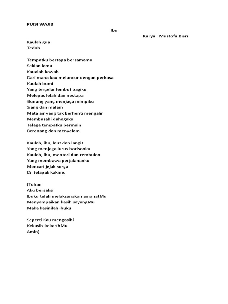 Puisi Untuk Ibu Mp3. Kumpulan lagu sedih, cerita tentang anak dan orang tua, jangan lupa like,comment,subscribe & share!! Di kala semua tak peduli, mama yang senantiasa berkorban. Pertama adalah contoh puisi pendek untuk ibu kumpulan apresiasi yang menarik karangan pembaca untuk ibu terhebat, dimana sosok seorang ibu tentunya memiliki peran yang sangat pentin dalam masa pertubuhan kita sehingga menjadi seperti saat ini. Biasanya puisi ibu menerangkan bagaimana ibu bisa sangat mencintai dan melakukan begitu banyak untuk buah hatinya. Sosok yang melahirkan kita ke dunia ini. Tapi, puisi ibu tercinta ini bisa mengungkapkan rasa sayang dengan cara berbeda yang istimewa. Puisi ucapan terimakasih untuk ibu aku telah berhasil bu. Berdiri gagah di sinpang jalan. Menyembuhkan orang yang sedang sakit. Puisi singkat tentang ibu yang mengingatkan betapa besar perjuangan beliau Puisi pendek ayah dan ibu. Seorang wanita yang rela mempertarukan nyawanya demi membawa kita pada dunia. Puisi ibu penuh rasa syukur dan kagum. Mama yang selalu membangunkan ku dan menjemput sebuah cita. Download lagu doa untuk ayah dan ibu upin ipin lagu anak sedih kill song mp3.