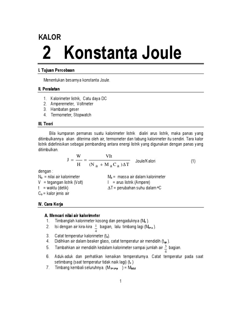 Energi kalor yang ditimbulkan arus listrik pada kumparan pemanas besarnya. Oleh karena itu gagasan terseb.ut diambil einstein untuk menjelaskan efek fotolistrik. Laporan k2/konstanta joule dan laporan akhir/k2 universitas gunadarma 2018/2019. Joule diambil dari satuan unit yang didefinisikan sebagai besarnya energi yang dibutuhkan untuk memberi gaya sebesar satu newton sejauh satu meter.oleh sebab itu, 1 joule sama dengan 1 newton meter (simbol: Teknik no & nama percobaan : Kak dian laboratorium fisika dasar upp ipd f universitas indonesia modul 1. Posted 1st december 2018 by ardy imanda. Selain itu, satu joule juga adalah energi absolut terkecil yang dibutuhkan (pada permukaan bumi) untuk mengangkat suatu benda seberat satu. => konstanta “a” adalah faktor pengali untuk mengubah satuan w (joule) menjadi dalam satuan kalori, agar kedua ruas mempunyai satuan yang sama => jadi :