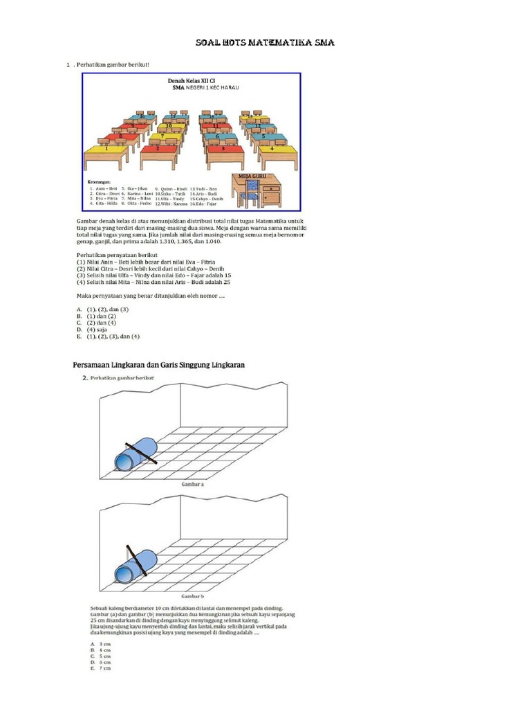 Contoh Soal Hots Matematika Sma. Contoh soal matematika hots berikut ini saya sajikan beberapa contoh soal kategori hots high order thinking skill mata pelajaran matematika. Sma negeri 27 garut jumlah soal :2 mata pelajaran : Diketahui 3 peserta pria dan 1 peserta wanita tidak lulus. Contoh soal hots sma matematika. Ketika tanda negatif bertemu dengan negatif maka operasi bilangannya akan berubah menjadi positif sehingga. Nomor 1 ~ soal hots matematika smp operasi bilangan. Untuk sanggup diterima di fakultas teknik, seorang calon mahasiswa harus lulus tes matematika dengan nilai tidak kurang dari 7, tes biologi dengan nilai minimal 5, dan jumlah nilai matematika dan biologi paling sedikit 13. Soal olimpiade fisika sma ini adalah bahan dasar untuk melaksanakan tahap ujian nasional berdasarkan kegiatan dalam kompetisi nasional dan internasional sehingga. Pengembangan soal hots matematika smp dan sma anwaril hamidy 15709251018 kelas b pendidikan matematika program pascasarjana universitas negeri yogyakarta 2016 fsmp 1. Jika menemukan kesulitan segera lanjutkan ke soal lainnya yang dirasa lebih mudah. Contoh soal hots materi integral. Tim yang menang memperoleh poin 3. 8 maka hitunglah jumlah peserta yang lulus ! Soal uts matematika kelas 7 semester 2 kurikulum 2013 dan kunci jawaban soal soal matematika kelas 7 semester 2 kurikulum 2013 fasrcircle disini saya akan menjawab no 1 2 dan 8. Soalunbkinfo soal dan pembahasan ujian nasional matematika untuk sma ips ujian nasional un semakin dekat seperti biasa kita perlu melatih kemampuan.