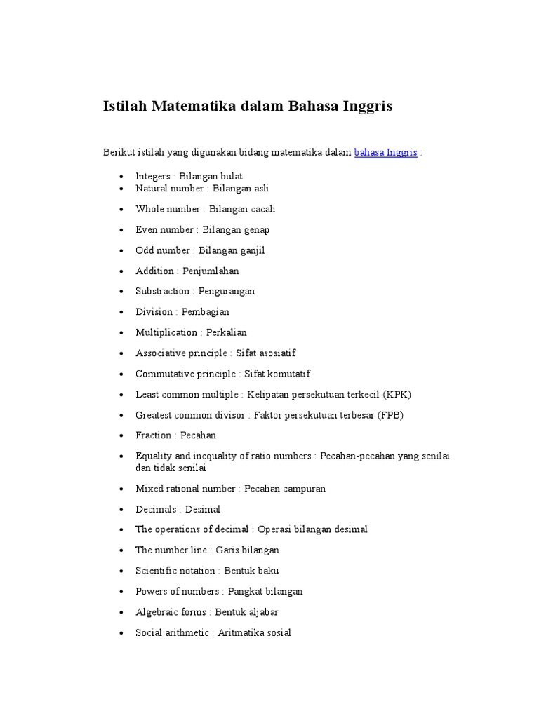 Istilah Matematika Dalam Bahasa Inggris Pdf. Even number = bilangan genap. 32 full pdfs related to this paper. Kita mengenal perhitungan operasi matematika seperti penjumlahan, pengurangan, perkalian dan pembagian, di dalam bahasa inggris maka kita akan sering menemukan kalimat tersebut di dalam penulisan atau percakapan, berikut adalah. Istilah matematika dalam bahasa inggris. 0.9 = nought point nine, atau zero point nine,point nine. Daftar lengkap 150 kosakata istilah bahasa inggris tps kuantitatif utbk. Three multiplied by seven is twenty one. Berikut ini adalah daftar istilah matematika, antara lain. Berikut operasi dan istilah dalam bahasa inggris yang biasa digunakan di mata pelajaran atau bidang matematika: Untuk cepat menguasai bahasa inggris maka anda harus berlatih untuk menggunakan bahasa inggris di dalam kehidupan sehari. Bagi kalangan umum, istilah, khususnya istilah matematika, adalah sesuatu yang terdengar asing di telinga mereka, tapi tidak bagi kalangan. Daftar istilah matematika dalam bahasa inggris. Istilah matematika dalam bahasa inggris. Siswa yang pertama kali ikut kelas bahasa inggris bisa jadi merasa kewalahan dengan seluruh istilah “teknis. Dari wikipedia bahasa indonesia, ensiklopedia bebas.